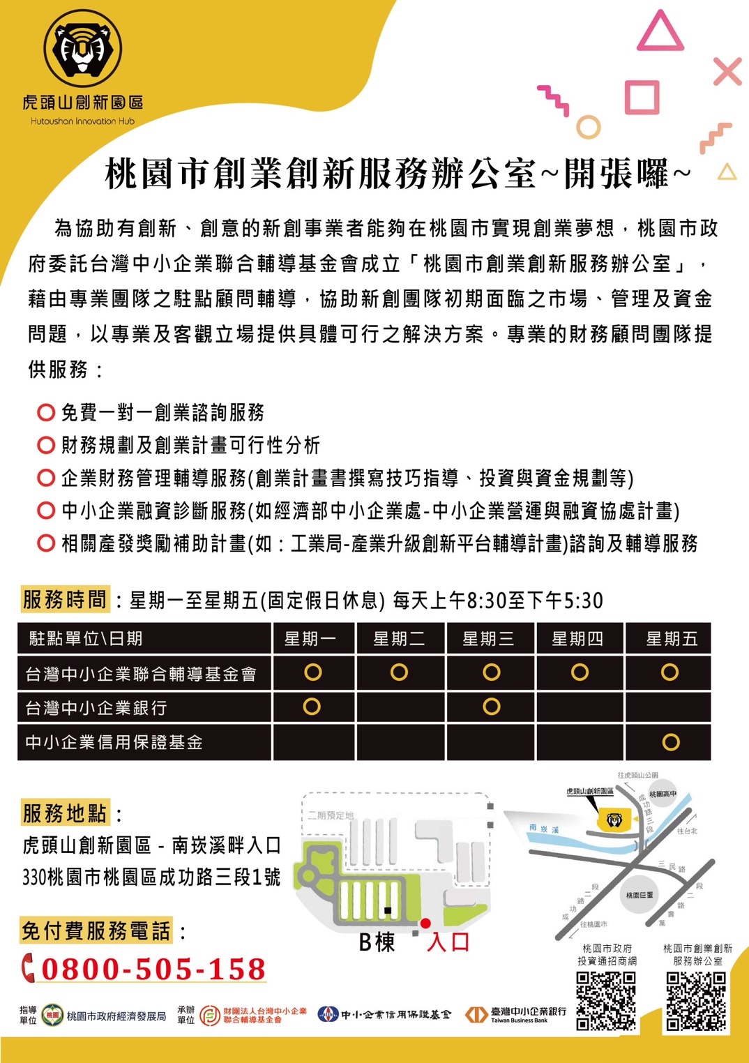 為協助有創新、創意的新創事業者能夠在桃園市實現創業夢想,桃園市政府委託台灣中小企業聯合輔導基金會成立「桃園市創業創新服務辦公室」,藉由專業團隊之駐點顧問輔導,協助新創團隊初期面臨之市場、管理及資金問題,以專業及客觀立場提供具體可行之解決方案。專業的財務顧問團隊提供服務: