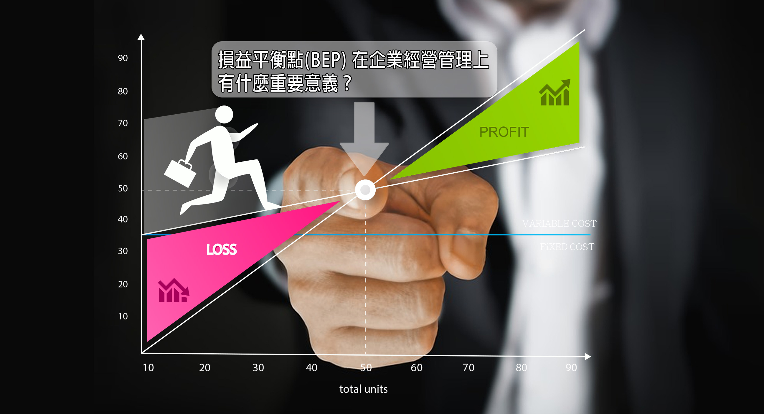 故在企業經營管理上,損益兩平愈低愈好,如何降低BEP的量,一從降低分子(固定成本),一從提高分母(提高售價與降低變動成本),雙管齊下。由於調高售價,掌控在客戶端,執行不易;降低成本掌握在自己手上,可立即進行,然固定成本皆已固定,降低空間有限,最後只有從降低金額大的變動成本(材料、電費等)著手。
